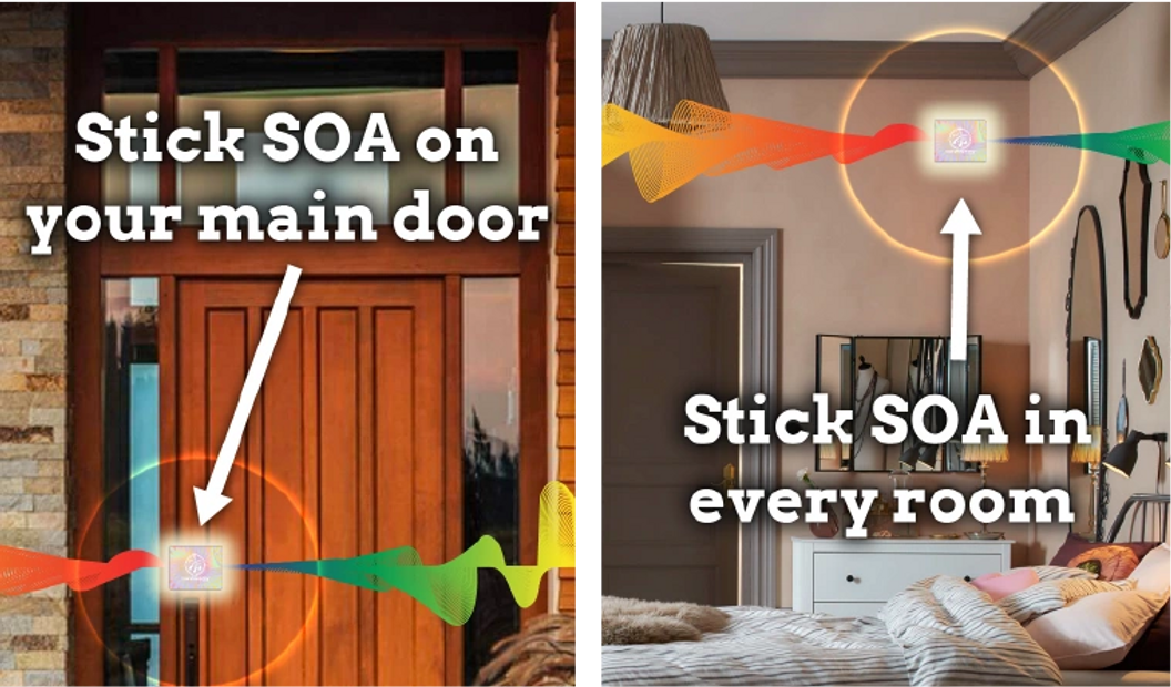 Home Space Harmoniser, once activated when stuck onto an object, each SOA generates the specific quantum waves informational field for its specific solution, allowing the user to achieve the desired success outcomes in their daily living.