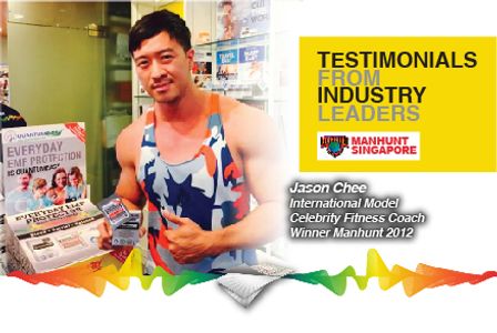 Selina Seah demonstrates the instant results of QuantumEasy EMF Protector with Jason Chee, Manhunt Winner