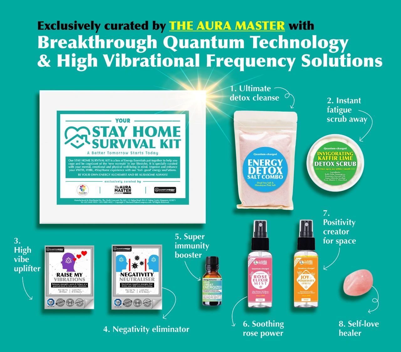 Just think of it as a modern alchemical box of ‘energy essentials’- there’s salt, scrub, oils, spray, mist and even quantum stickers in here!